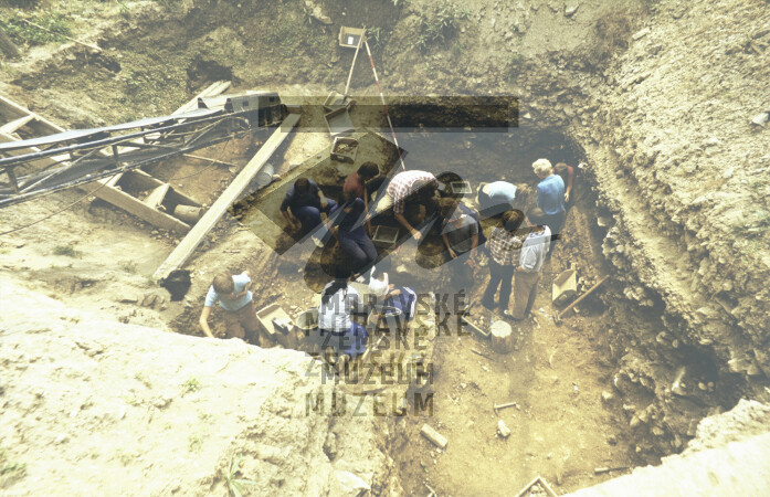 Výzkum v předpolí jeskyně (jižní portál); předkloněný v kostkované košili Vilém Gebauer. Diapozitiv, 1976.