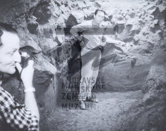 Profil A/29 s nálezem neandertálské čelisti. V Gebauer drží čelist v poloze nálezu a Tobias fotografuje. 1965; diapozitiv.