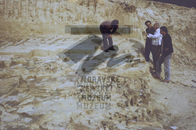 Diskuse nad kulturní vrstvou gravettienu. Zleva: L. Seitl, K. Valoch, R. Musil a A. Otta.