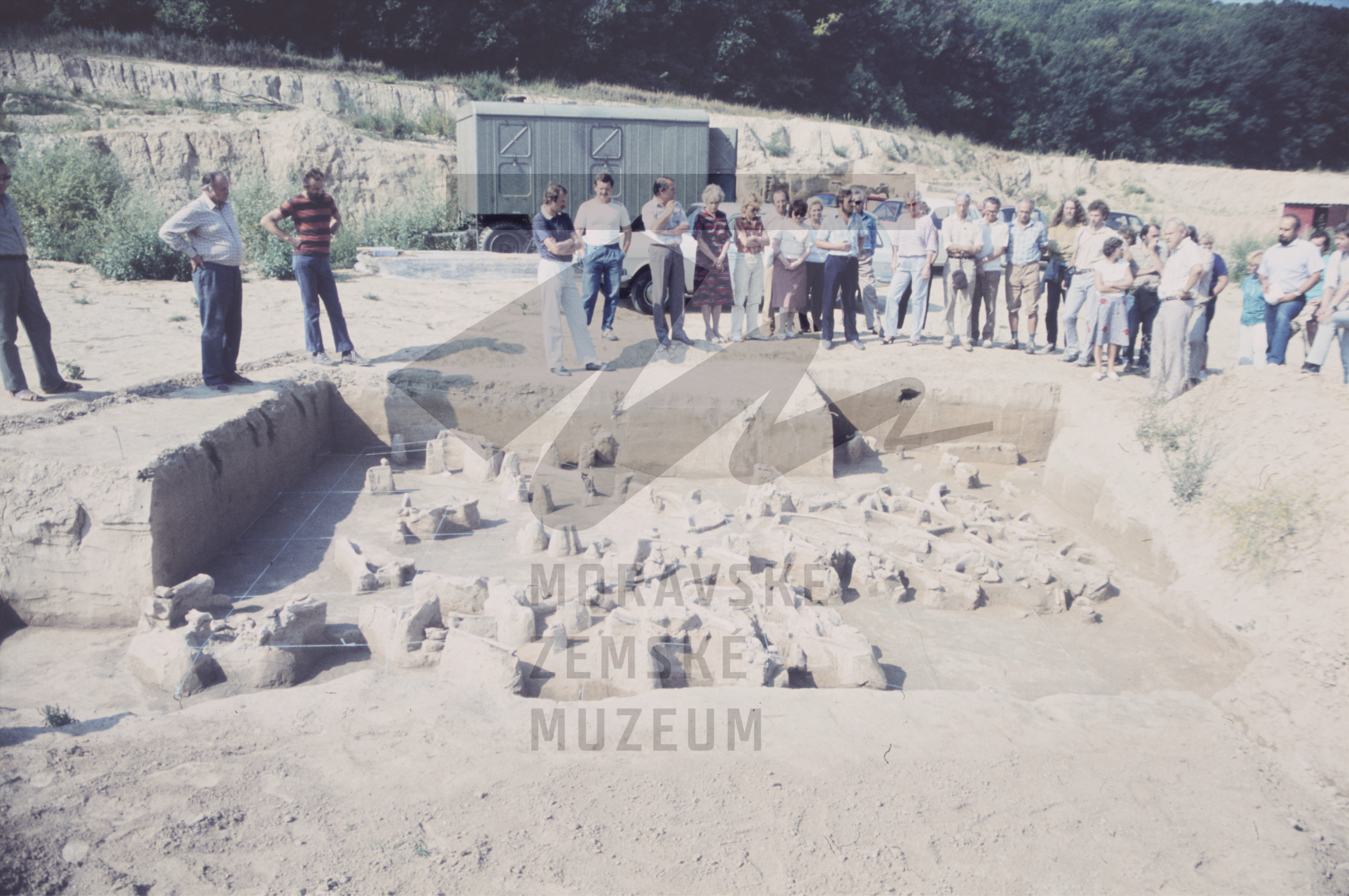 Komise na výzkumu gravettienské vrstvy. Karel Novák (druhý zleva), Oldřich Kroupa (třetí zleva), M. Oliva (vpravo v bílé košili s rukou v bok).