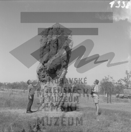 Termitiště na cestě do Darwinu. Stojící Jan Daněk a Jiří Vrožina s fotoaparátem.