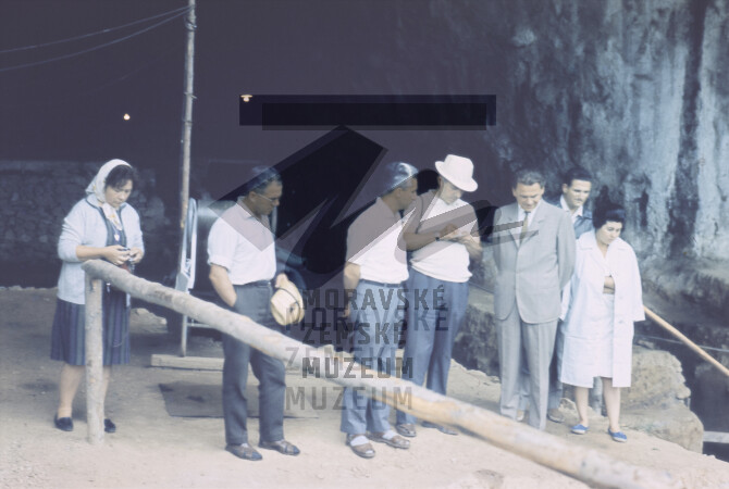 kongres UISPP 1966 exkurze, dia v kovových rámečcích. V bílém klobouku R. Naugier, vpravo od něj K. Valoch (v šedém obleku), vlevo od Naugiera Cl. Barriere.